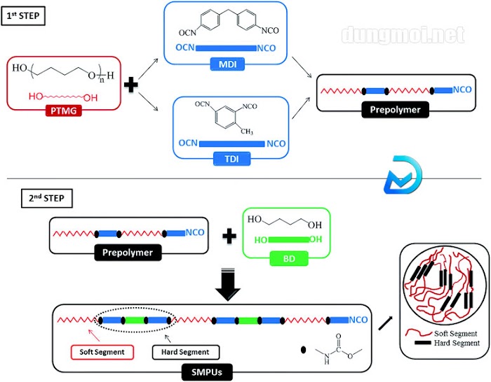Hóa chất tổng hợp Polyurethane (PU) được hình thành từ phản ứng hóa học giữa isocyanate (ISO) và polyol (POL).